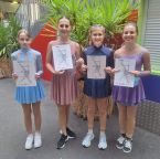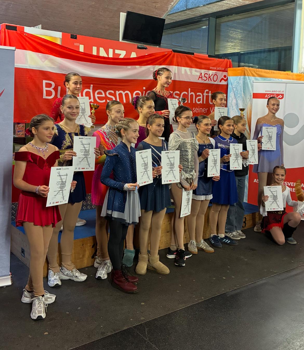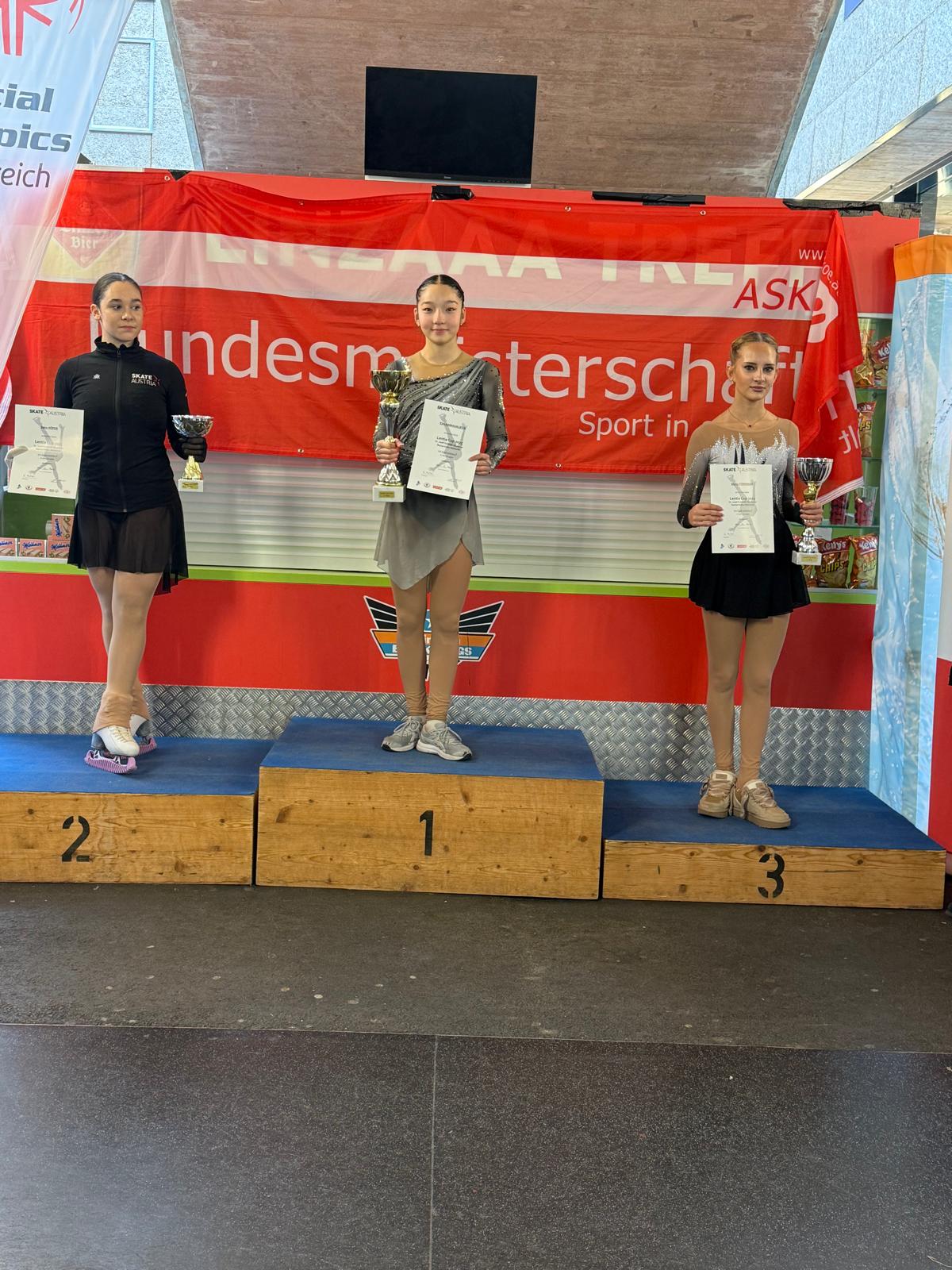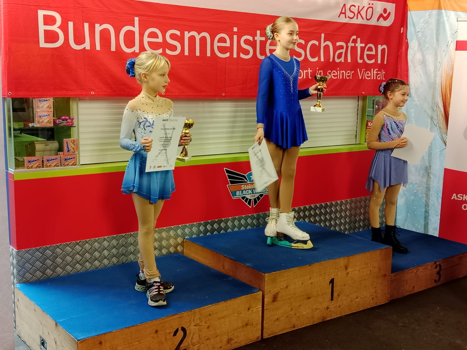 Theresa Ecklbauer (12), Polina Zeciri (11) und Lara Grieshofer (11, fällt derzeit leider verletzt aus) stiegen mit Saisonstart aufgrund der erreichten Punkte in die Kategorie Advanced Novice mit Konkurrentinnen bis 16 Jahre auf. Theresa und Polina konnten sowohl im Kurzprogramm als auch in der Kür ihre Trainingsleistungen abrufen und ihr Können zeigen.
